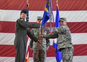 U.S. Air Force Col. Michael Hernandez, 325th Fighter Wing commander (left), presents the 325th Mission Support Group guidon to the incoming 325th MSG commander, Col. Matthew Jefson (right), during the 325th MSG Change of Command ceremony at Tyndall Air Force Base, Fla., June 30, 2017. Jefson