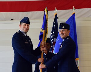U.S. Air Force Col. Ryan J. Suttlemyre, 33rd Operations Group commander, passes the ceremonial guidon to Lt. Col. Michael J. Lynch, incoming 337th Air Control Squadron commander, during a change-of-command ceremony at Tyndall Air Force Base, Fla., May 4, 2018. The 337th ACS’s primary responsibility