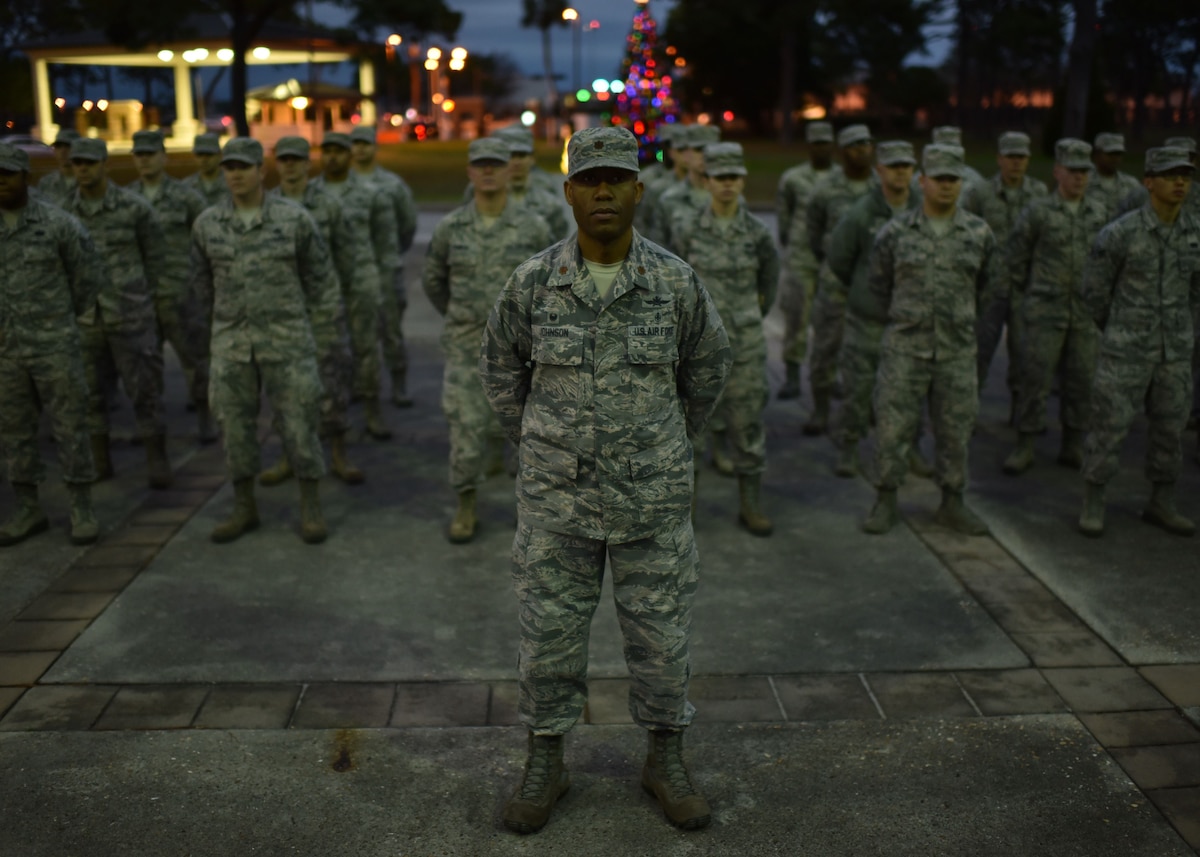U.S. Air Force Master Sgt. Jason Ramirez, 325th Communications Squadron first sergeant, holds the 325th CS guidon at parade rest before a retreat ceremony at Tyndall’s Flag Park Dec. 6, 2017. (U.S. Air Force photo by Senior Airman Sergio A. Gamboa/Released)