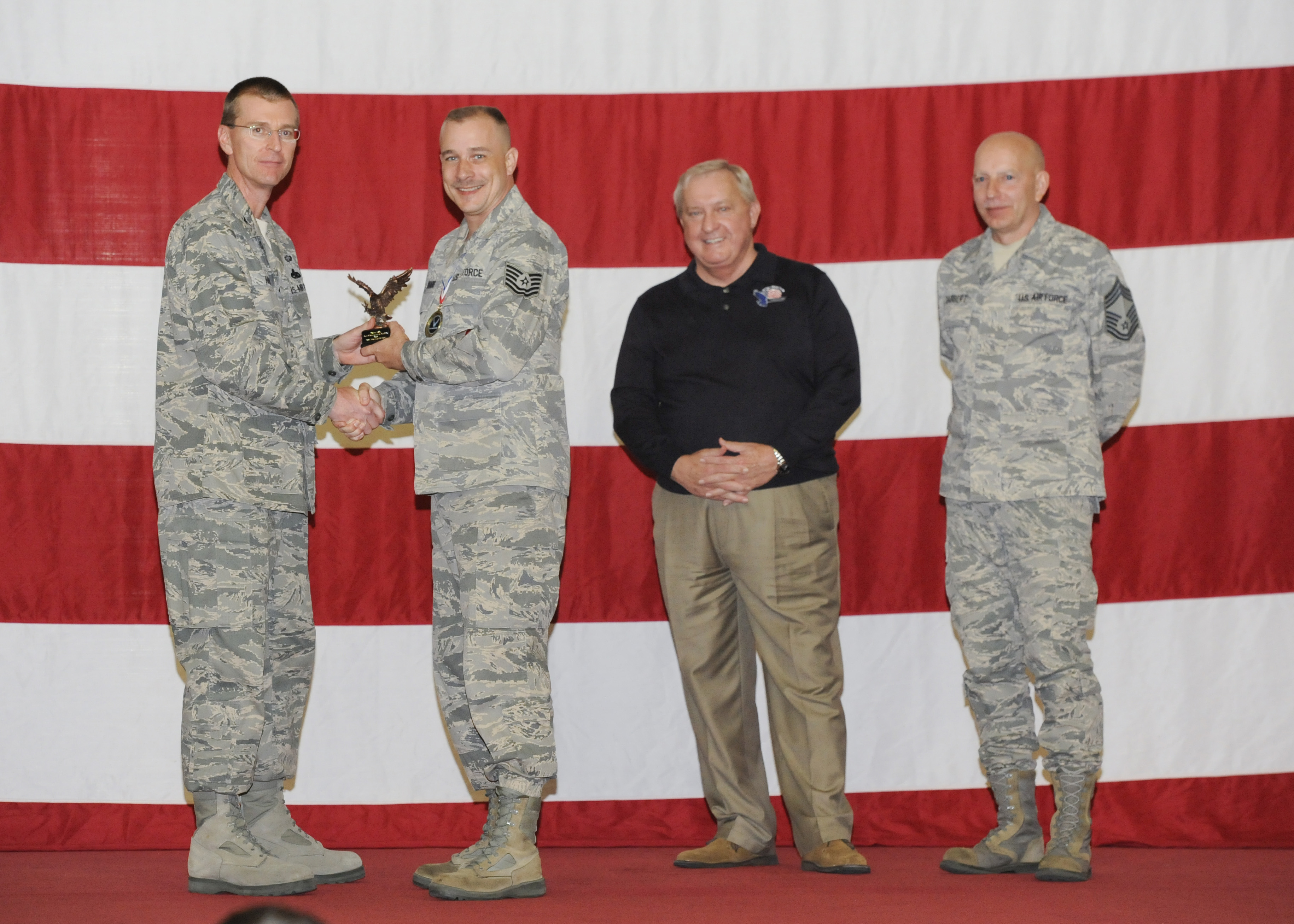 Tech. Sgt. Ronald Brooks, 325th Maintenance Operations Squadron, receives the award for Air Combat Command Analysis of the Year Maintenance Manager of the Year in the NCO category from Col. Curtis Hafer, 325th Maintenance Group commander, and Chief Master Sgt. Terry Gabbert, 325th MXG superintendent, and retired ninth Chief Master Sergeant of the Air Force, Chief Master Sgt. James Binnicker, during the 2012 Maintenance and Staff Professionals of the Year banquet in Hangar 1 March 15. The MPOY banquet recognizes the achievements of the maintenance group and honors maintenance professionals each year. (U.S. Air Force photo by Chris Cokeing)