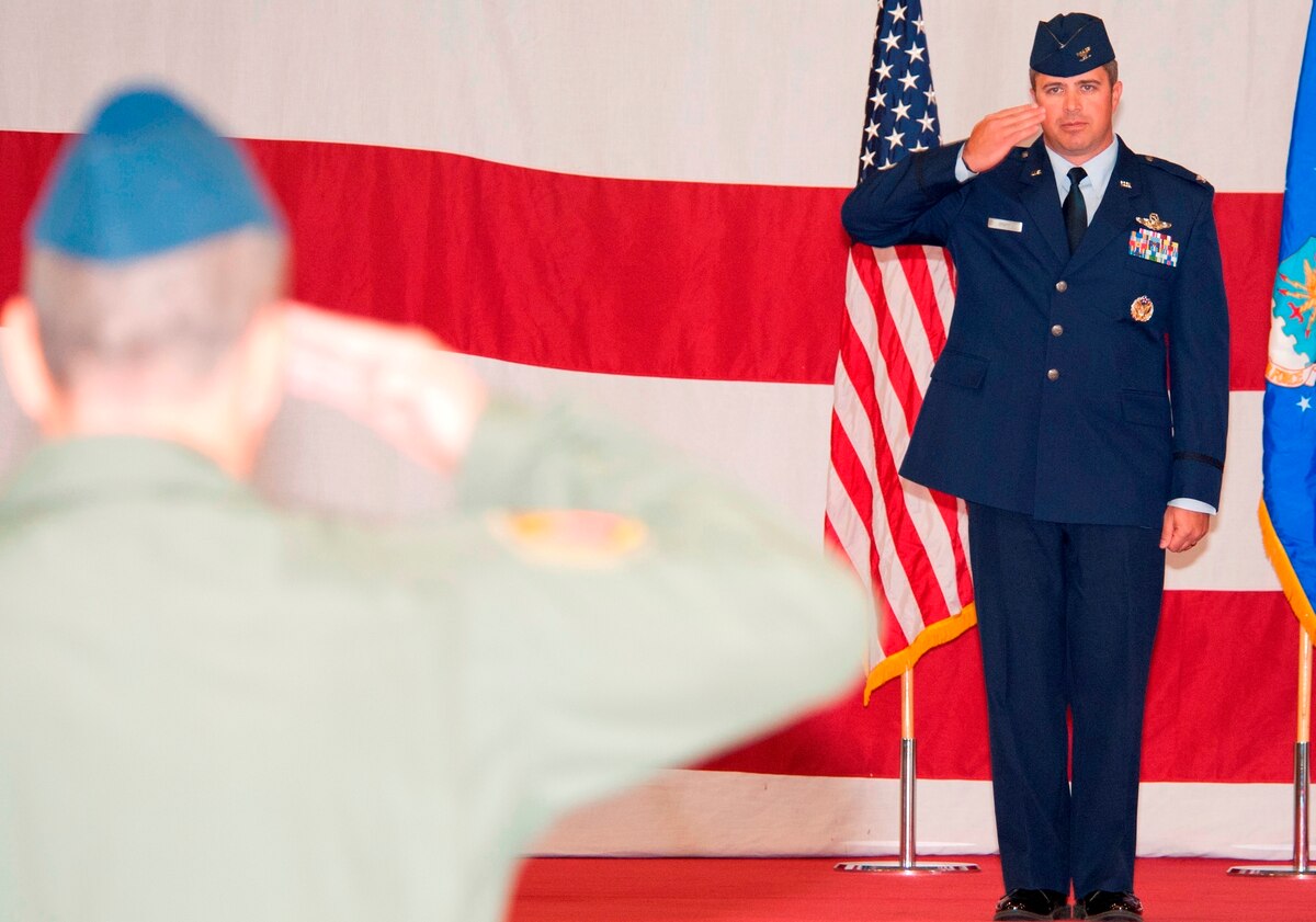 U.S. Air Force Col. David Graff, 325th Fighter Wing commander, executes his first salute as commander during the wing change of command ceremony at Tyndall Air Force Base, Fla., Nov. 14. The 325th FW, which used to fall under Air Education and Training Command, is now aligned under Air Combat Command. (U.S. Air Force photo by Lisa Norman/Released)