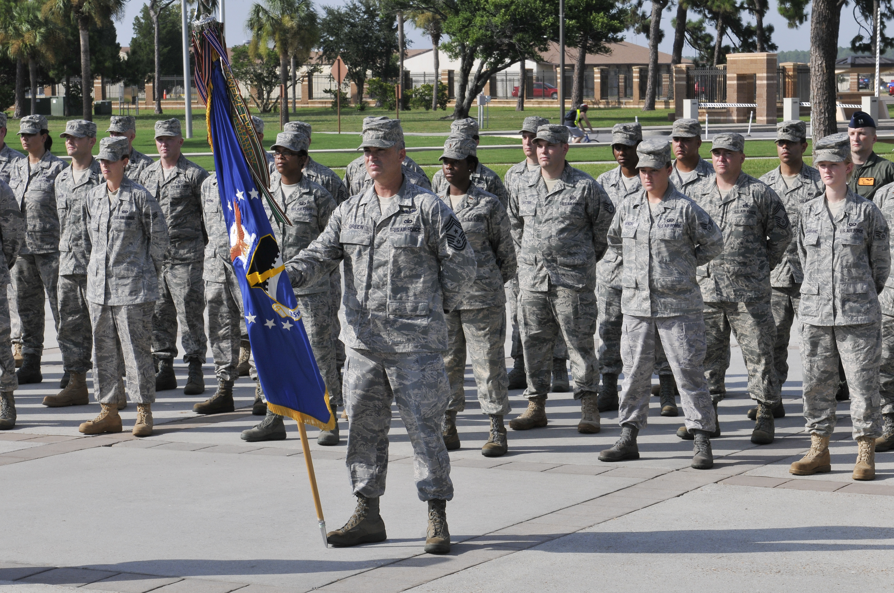 Members of the 325th Fighter Wing staff stand at parade rest in preparation for a retreat ceremony July 14. Chief Master Sgt. Jackie Green, 325th FW command chief, serves as the guidon. Retreat ceremonies will be held each month and be rotated among the squadrons. (U.S. Air Force photo/Lisa Norman)