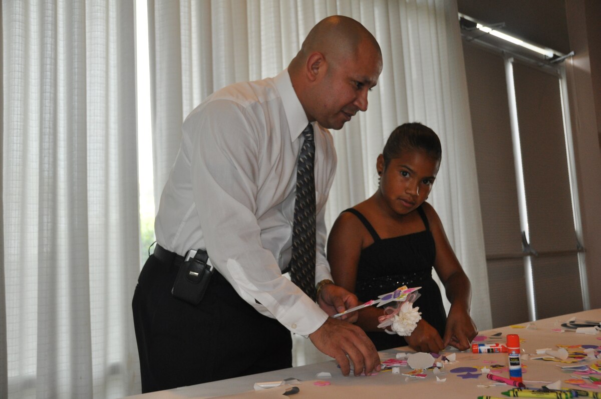 Senior Master Sgt. Paul Figueroa, 325th Communications Squadron Cyber Operations superintendent, joins his eight-year-old daughter Kieria Figueroa, in making a tiara during the Daddy Daughter Dance June 17. (U.S. Air Force photo /Senior Airman Veronica McMahon)