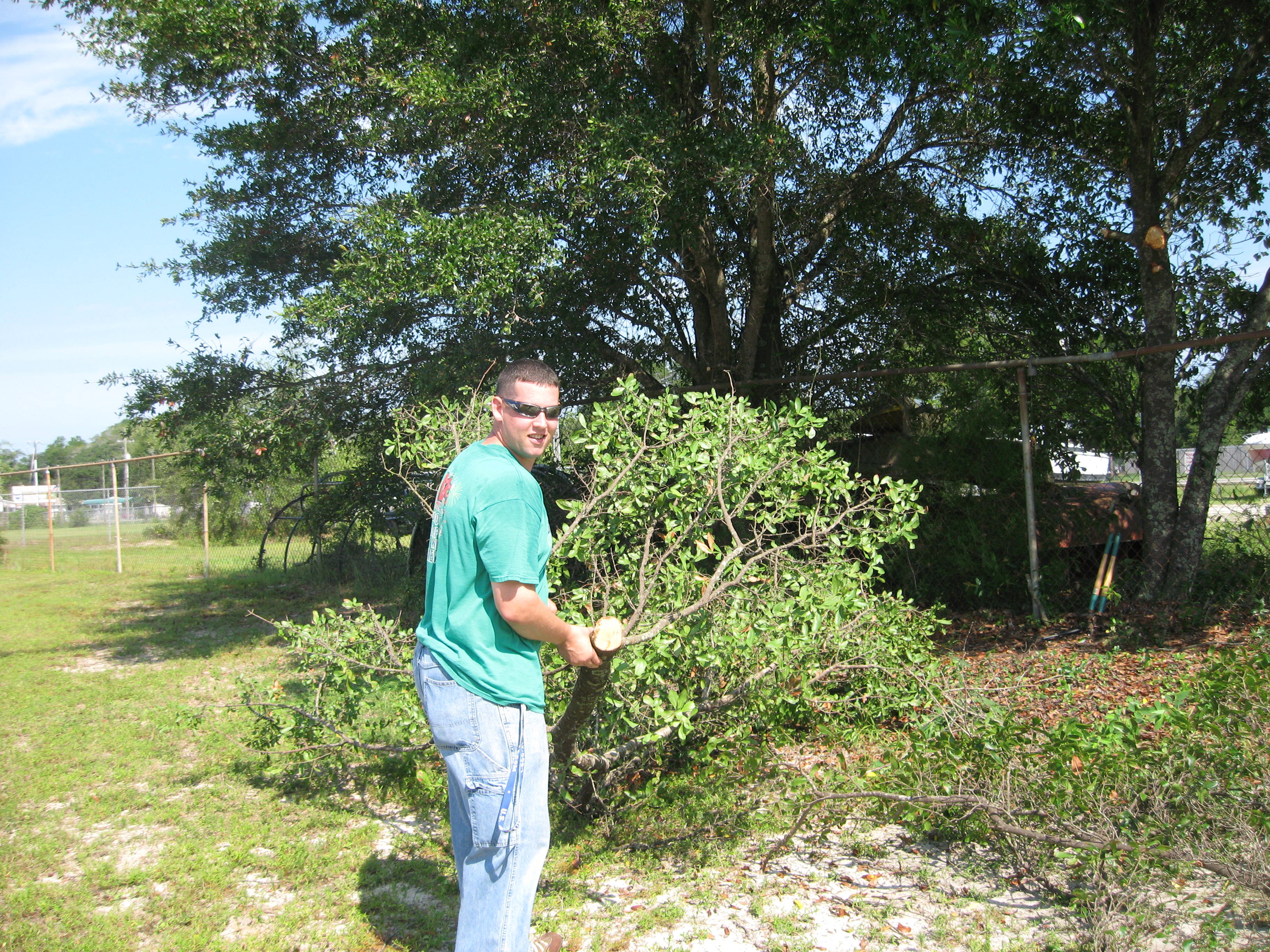 Staff Sgt. Brandon Signorotti, 325th Aircraft Maintenance Squadron F-15 Weapons Load Crew Team chief, hauls away cut tree limbs in efforts to clean up Oscar Patterson Elementary for them to open for the school year as scheduled. (Courtesy photo)
