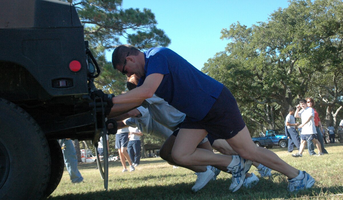(From left) Brig. Gen. Darryl Roberson, 325th Fighter Wing commander, retired Col. James Frishkorn, 325th Mission Support Group deputy directory, Col. David Zeh, 325th Mission Support Group commander, and 1st Lt. Patrick Wilkinson, 325th Force Support Combat Support flight commander, enjoy lunch together during the Sports Day cook out. (U.S. Air Force photo by Staff Sgt. Vesta M. Anderson)