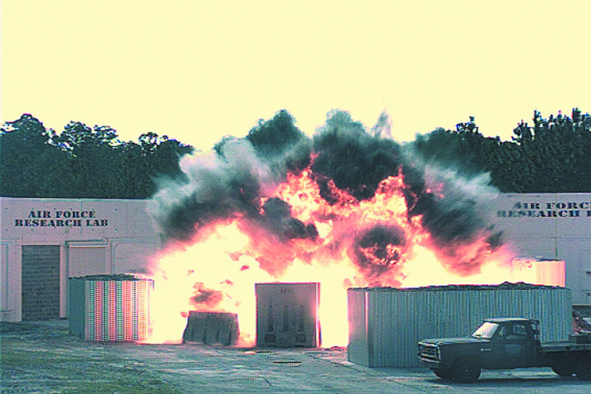TYNDALL AIR FORCE BASE, Fla. -- A 500-pound explosive detonates at the Air Force Research Laboratory/Detachment 2 Sky X range here. The purpose of the experiment was to validate the blast protection provided by various earth and water-filled barriers, as well as evaluate two building walls in the experiment. (U.S. Air Force photo by Lisa Norman)