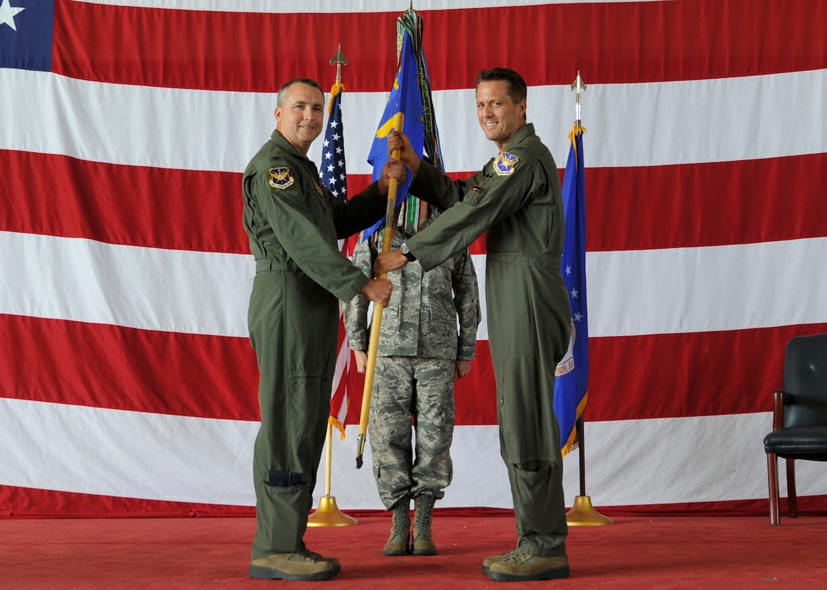 Colonel John Breazeale, 301st Fighter Wing commander, Naval Air Station Fort Worth Joint Reserve Base, Texas, passes the 44th Fighter Group guidon to Col. Scott Crogg who assumed command of the 44th FG during an assumption of command ceremony July 12. The 44th FG, a tenant unit at Tyndall, belongs to the 301st FW and is the last phase of the Holloman transfer to arrive at Tyndall. (U.S. Air Force photo by Airman 1st Class Ty Lea)