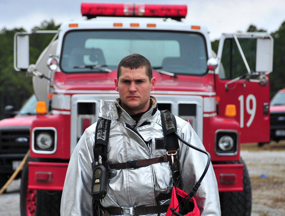From left to right: Col. David E. Graff, 325th Fighter Wing commander, receives help from Airman 1st Class Bradley Gettel, 325th Civil Engineer Squadron fire and emergency services fire protection apprentice, suiting up for firefighting training March 7 at the Fire Department Training area. Gettel was chosen to represent the 325th Mission Support Group as the Airman to be shadowed by the commander. (U.S. Air Force photo by Airman 1st Class Sergio A. Gamboa)