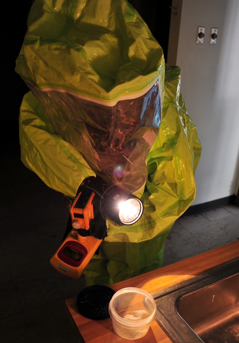 Tech. Sgt. Lacy Johnson, 325th Aerospace Medicine Squadron bioenvironmental engineering technician, shines a flashlight at an unknown substance during an Integrated Base Emergency Response Capabilities Training exercise Feb. 20 at the golf course club house. The Alliance Solutions Group Inc., from Newport News, Va., partnered with Air Combat Command and Air Mobility Command in coordinating the training throughout ACC and AMC bases. (U.S. Air Force photo by Airman 1st Class Sergio A. Gamboa)