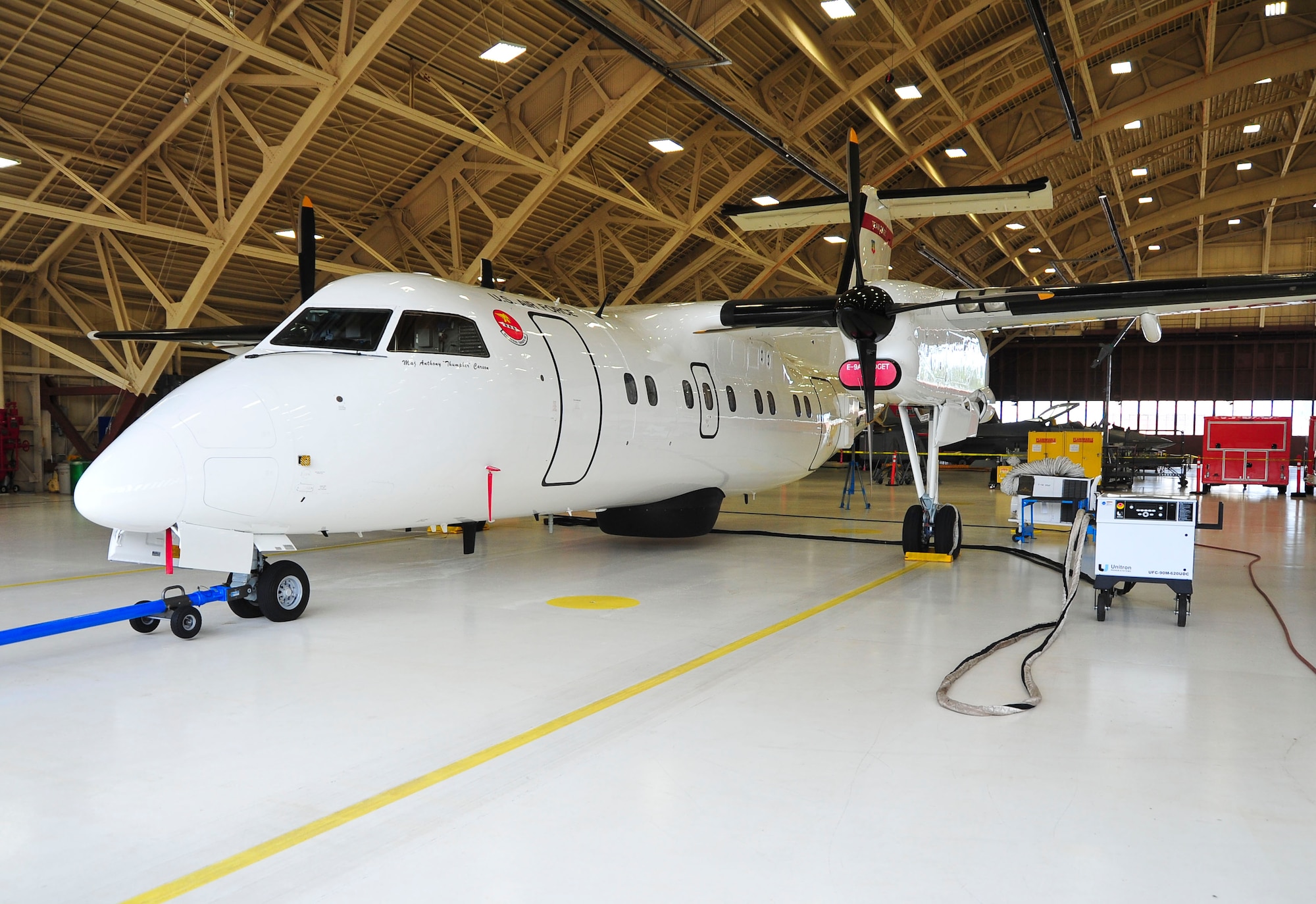 An E-9A Widget sits on the flight line in front of hangar 5 Mar. 3 at the 82nd Aerial Target Squadron. The Widget is a modified version of the Bombardier Dash-8, formerly Canadian De Havilland. The modified civilian Dash-8 was brought into service in 1988 and is assigned to the 53rd Weapons Evaluation Group. (U.S. Air Force photo by Airman 1st Class Dustin Mullen/Released)