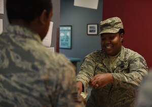 U.S. Air Force Staff Sgt. Shatirah Avilez, 325th Force Support Squadron Raptor Quick Turn assistant NCO in charge, gives change to an Airman after purchase of their meal at the Raptor Quick Turn dining facility at Tyndall Air Force Base, Fla., April 17, 2018. To ensure the readiness of members of